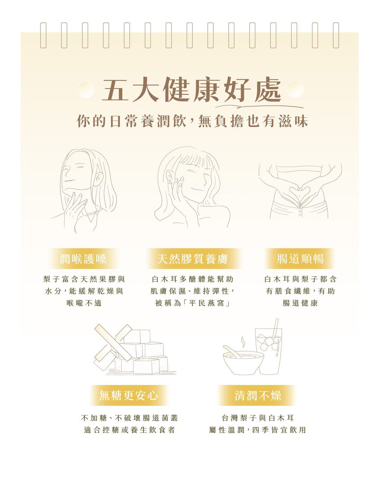 成分:水、梨子(台灣)、雪珍白木耳(台灣)